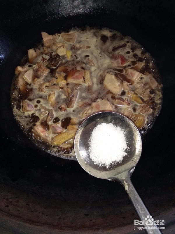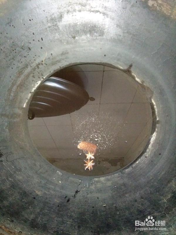 4/9大铁锅倒油1升,烧大火。放入大料和桂皮。(老婆婆家没有草果,否则草果也是少不了的)