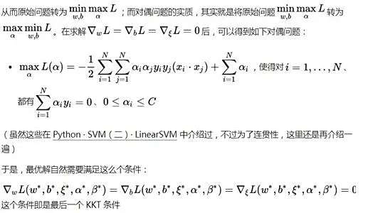 这些点非常特别,这是因为超平面的参数完全由这三个点确定。该超平面和任何其他的点无关。如果改变其他点的位置,只要其他点不落入虚线上或者虚线内,那么超平面的参数都不会改变。A,B,C 这三个点被称为支持向量(support vectors)。