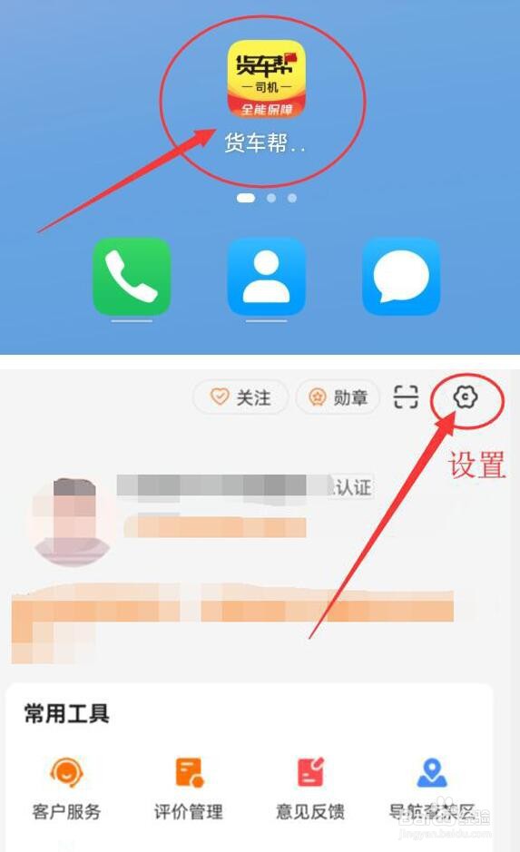 打开“货车帮司机版”App,点击设置按钮(齿轮图标)进入,如图箭头所示。