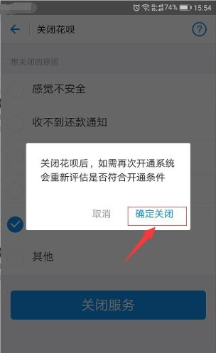 5、点然后此时就会弹出一个页面,在此页面选择勾选关闭花呗的理由。