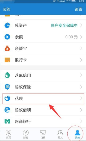 1、首先打开手机上的“支付宝”app,接着在此“我的”页面内点击上方的“花呗”选项。