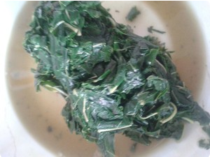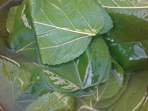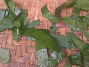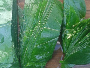 5、然后把蒸好的桑叶用手揉,揉的越均匀越好,挤去多余的水分。如下图所示: