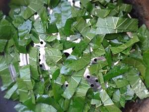 2、然后把洗好的桑叶摆好,一刀一刀下去,切成条状即可。如下图所示: