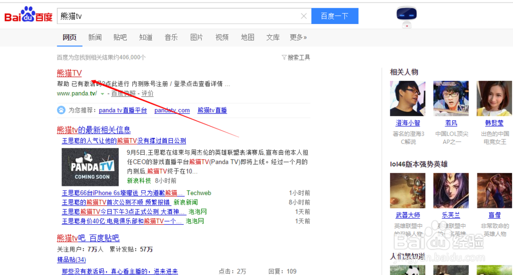 我们打开百度输入“熊猫TV”,进入熊猫TV首页,如图。