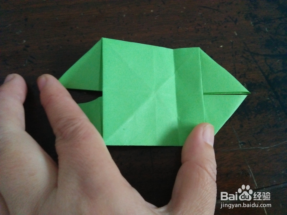 5/6然后在中间对折,再把面前的角向上折,后边的向后折。再把每个角向内折,如图二。
