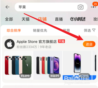 打开手机淘宝,输入苹果,选择Apple Store官方旗舰店,点击进店