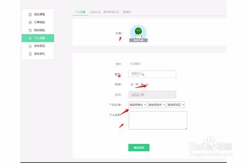 4/6登录成功以后,点击学生中心-个人设置,上传个人头像、修改昵称、生日、个人介绍说明点击提交按钮即可。