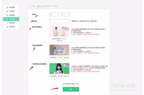 5/6学生中心-实名认证,填写姓名、身份证号码、上传身份证正反面、手持身份证照片点击提交按钮。上传图片要求属于本人,图片清晰。上传文件格式支持png,jpg和bmp文件大小不超过5M,文件尺寸最小为500px*500px。