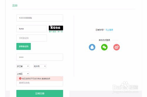 打开网址,点击注册按钮,进入注册页面。填写手机号码、输入验证码、密码获取手机验证码、所属区域。区域一旦填写不可修改,有邀请码填写邀请码,无邀请码可以不填。
