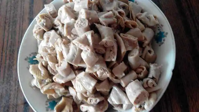 在食用这种食物的时候,一般都需要先将大蒜切碎并捣成泥,然后将苦肠切成片状蘸取蒜泥食用。不过有的商家会用鸡肠制作苦肠并售卖,我们在购买的时候要注意分辨。