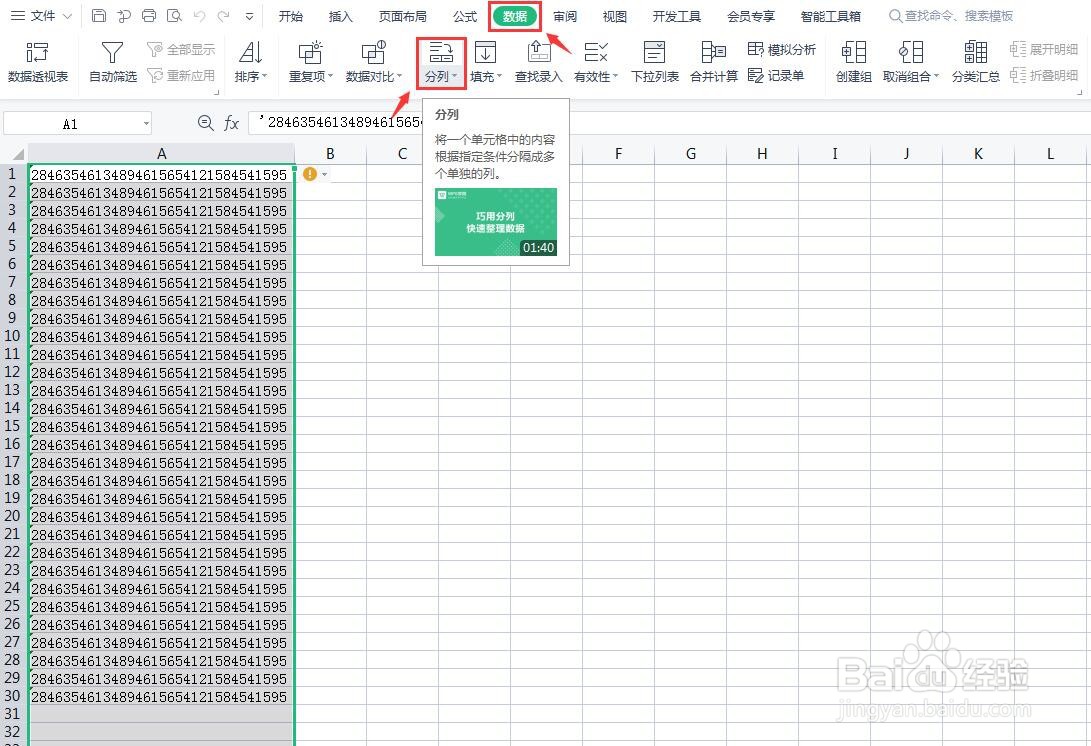 2/6第二步,找到上方“数据”菜单,点击“分列”选项;