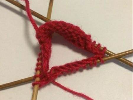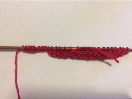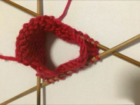 6,然后把这28针分配在3根棒针上,开始编织下针。在编织过程中要想办法吧刚刚加的10针调整在一头一尾的两根棒针上。这样便于以后的收针。