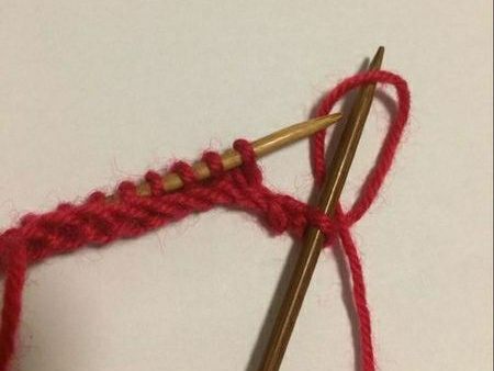 3,接着在开头织一针下针后加两针针,加针方法在右边的棒针上绕两圈。然后织到还有一针时再加两针,加针都在正面进行。
