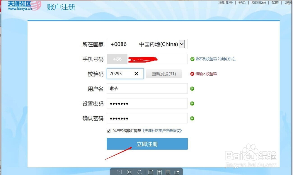 4/6填写手机号码,校验码,用户名,输入密码,确认密码(密码和确认密码必须是完全一样,否则无法注册)点击立即注册