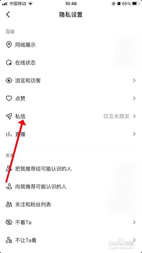 3/4第三步:在隐私设置页面,点击【私信】选项进入!