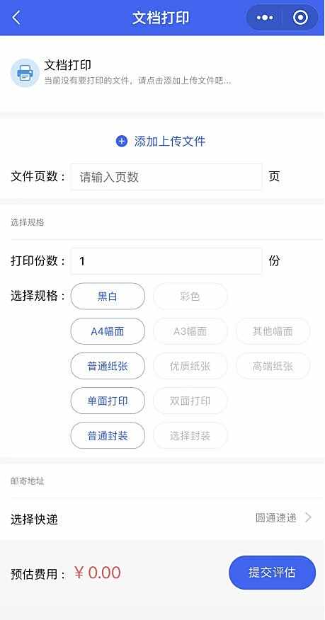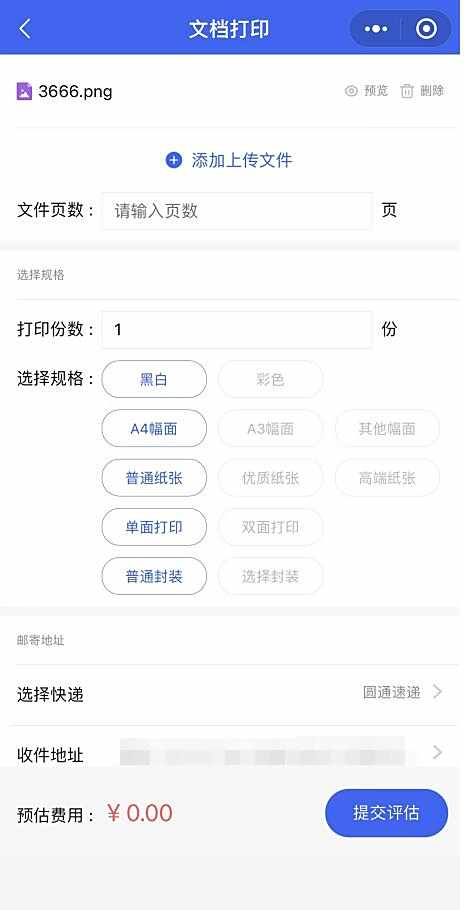 3. 成功添加文件后,需要自行选择打印的规格、快递方式、收货地址等,然后提交评估;