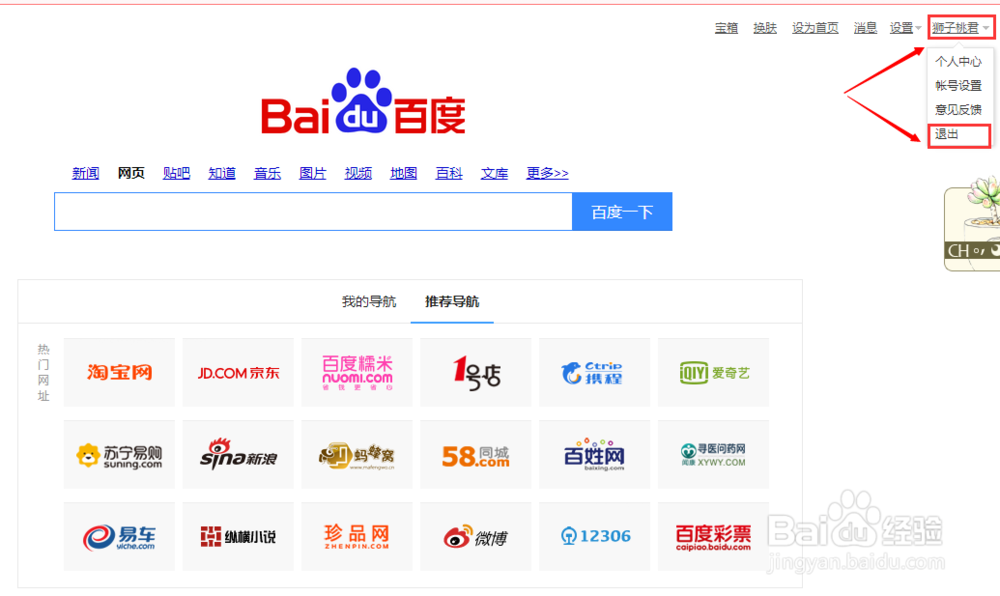 4/7这一步很关键,之前的页面不要关闭,重新打开一个搜索引擎的页面,上面登录的依旧是之前的账号信息,我们点击退出。