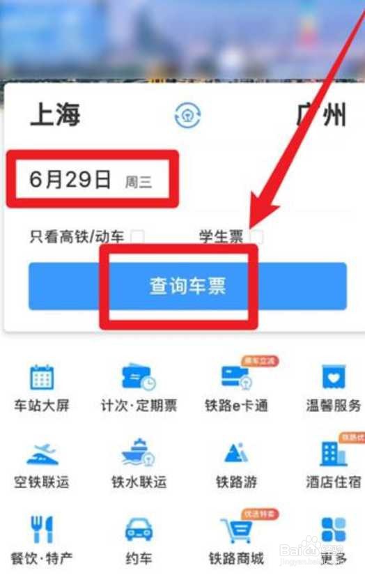打开铁路12306软件界面, 选择火车票的时间,始发地,点击查询火车票。