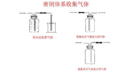 使用带双导管的集气瓶并用排气法收集气体时(瓶口向上),若气体的式量大于29(如Cl2),气体应从长导管进,将空气从短导管排出;若气体的式量小于29(如H2),则气体应从短导管进,将空气从长导管排出。