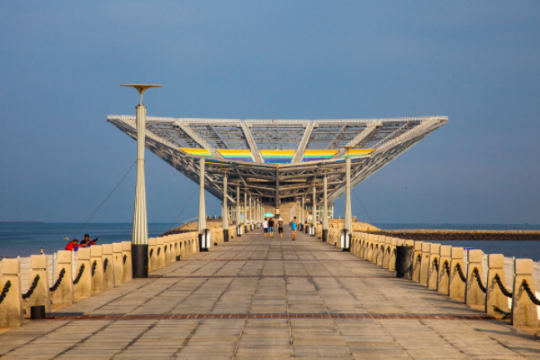 山海广场景区位于营口开发区西部海滨旅游带,总占地面积40万平方米,由山海广场、新月牙湾浴场、观海堤(栈桥)、渤海明珠观景台(贝壳)及鲅鱼公主雕塑等组成。