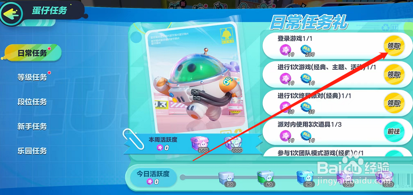 很多人不知道,蛋仔派对怎么领取登录礼品呢?下面小编来介绍一下具体的步骤品牌型号:苹果6plus系统版本:iOS12.0.0.1软件版本:蛋仔派对13.2.0方法/步骤1/4分步阅读