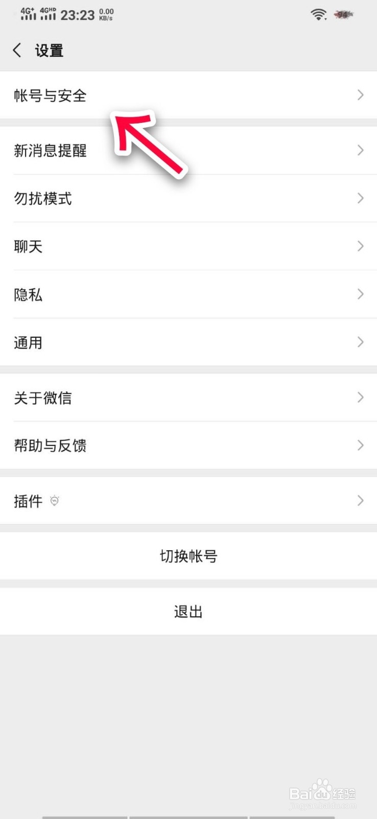 首先。打开我们手机上的微信,在【我】这一栏点击【设置】,然后进入【账号与安全】。