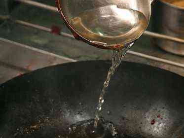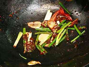 3、转大火,放入葱段、老姜片、辣椒段,炒匀。