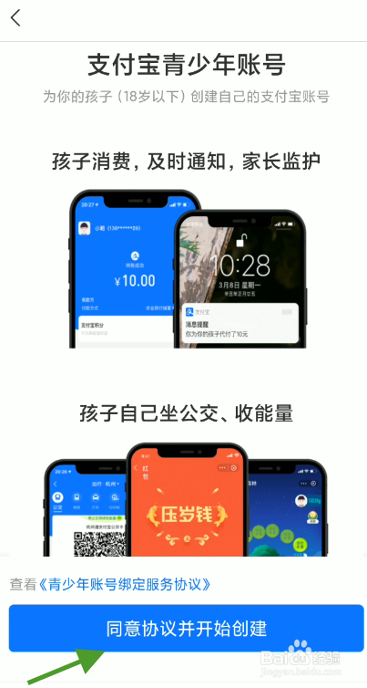 4/5进入支付宝青少年账号点击同意协议并开始创建按钮。