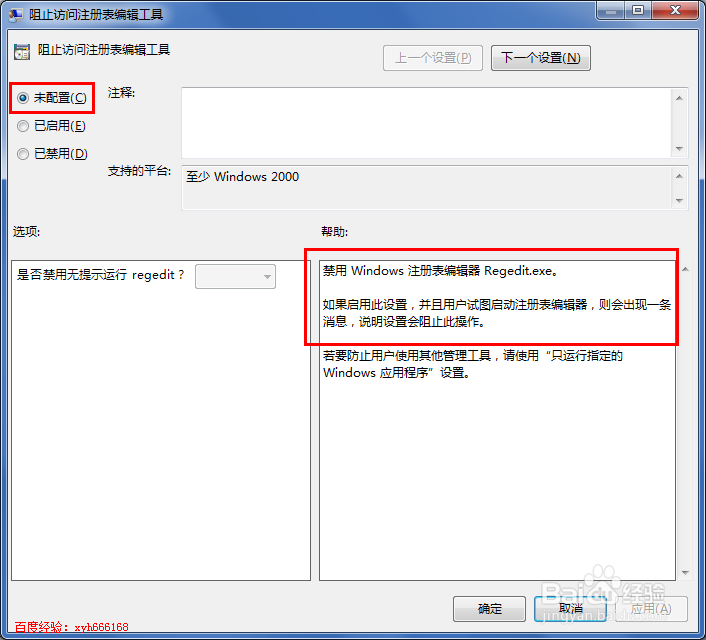 6/8“阻止访问注册表编辑工具”的设置对话框,如下图所示,在右边的帮助下面我们可以看到关于此功能的设置介绍