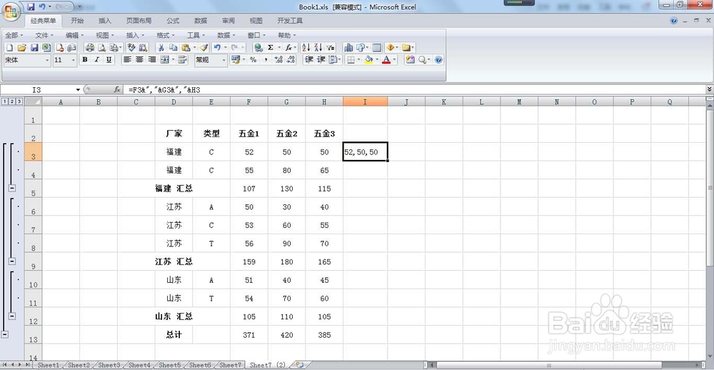 3/7如果想把内容用固定的符号分割开,比如用逗号分开,只需在公式中添加逗号即可:=F3,G3,H3。