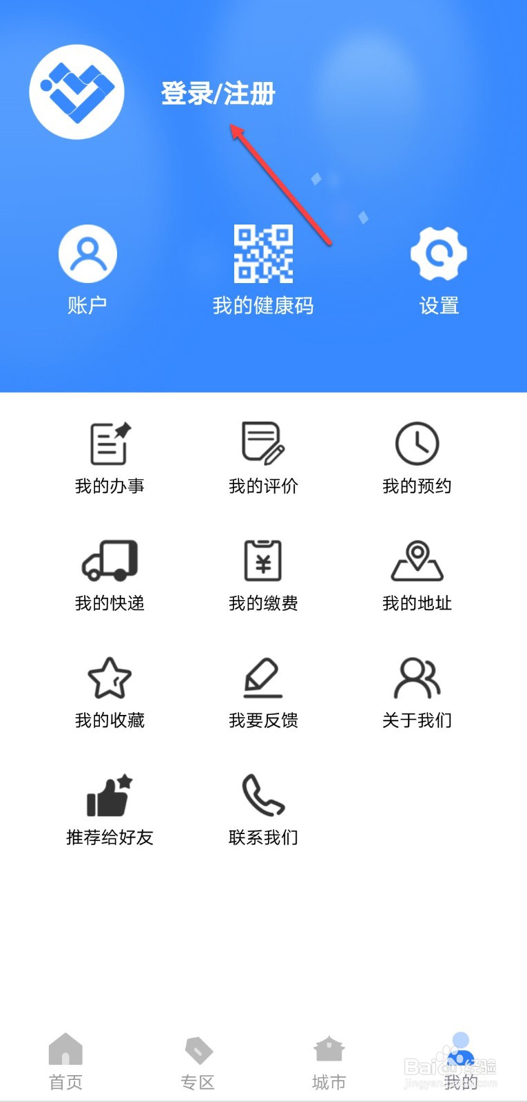 2/4进入我的界面,点击登录/注册。