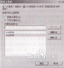 3/3在如图3所示的窗口添加该用户可以登录到的计算机名称,默认是可以域内“所有计算机”登录,单击【下列计算机】按钮,而后输入计算机名称,单击【添加】按钮,可以添加多台计算机,从而指定从特定计算机登录。