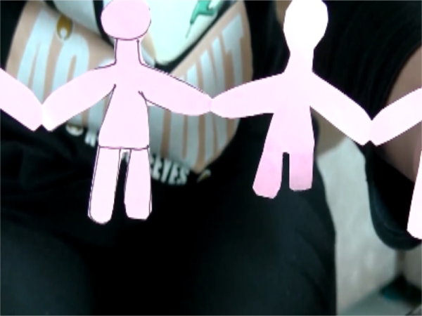 6.剪完后,打开它,四个小家伙会手拉手的。你可以根据自己的喜好来设计小人物的外观和装饰,还有人数就是怎么简单。