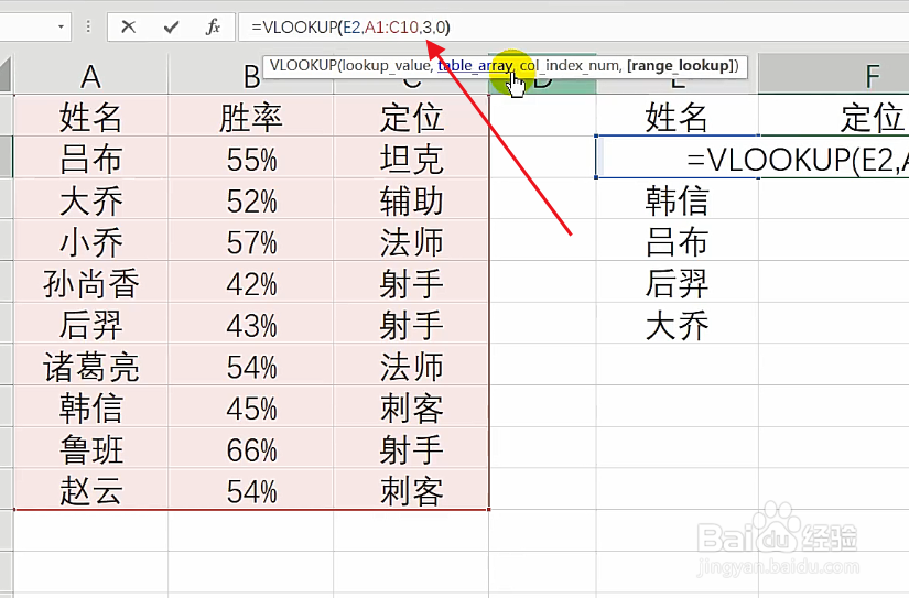 2/6接着我们在第一个单元格写上vlookup函数,如下图所示