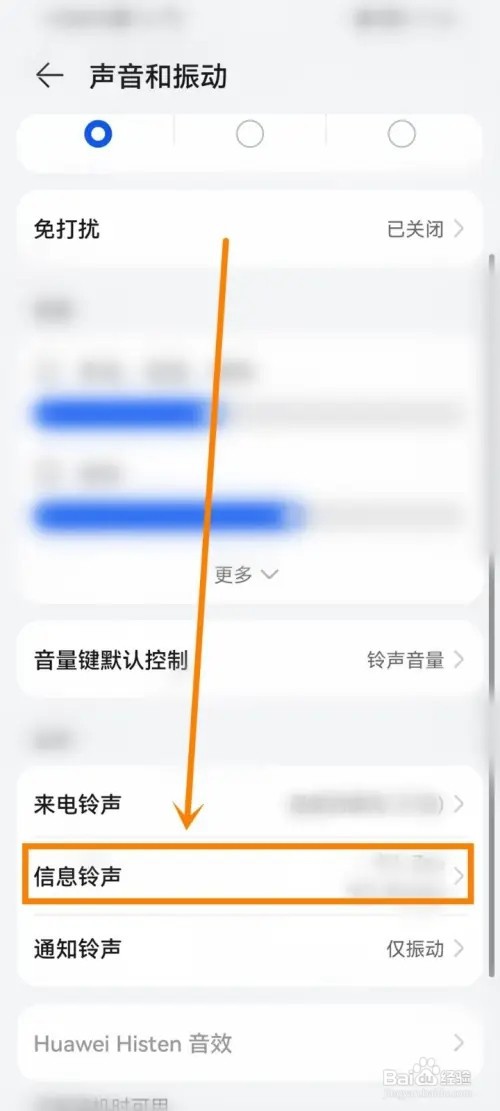 3/4进入声音和振动设置,点击【信息铃声】选项。