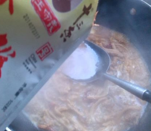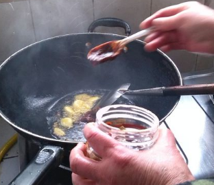 六、加入豆瓣酱2勺,炒出香味,不要炒太久;