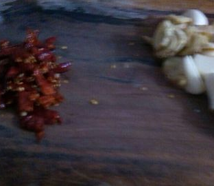 三、姜洗净切成片,大蒜去皮,掰成蒜瓣,干辣椒切成末。
