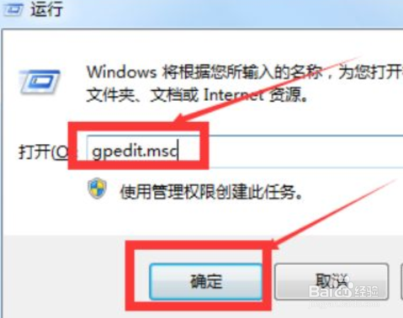 按win+R快捷键,输入gpedit.msc,点击确定。