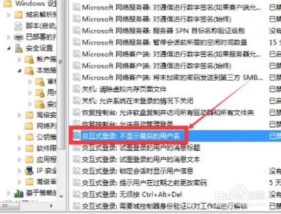 侧列表双击交互式登录:无须按ctrl+alt+del ,点击已启用,关闭策略编辑器,重启即可。