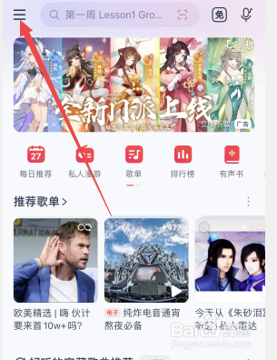 网易云音乐点击左上角三横符号。
