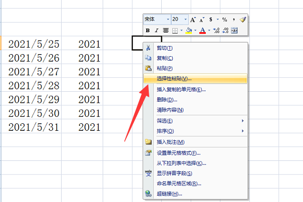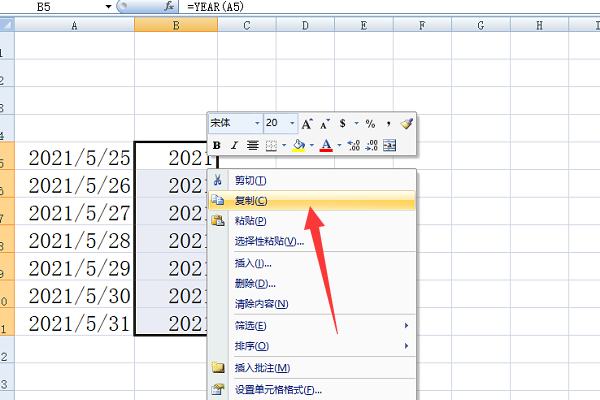6、如不需要前面的日期格式,可以通过选中该年份数据,点击右键选择复制。