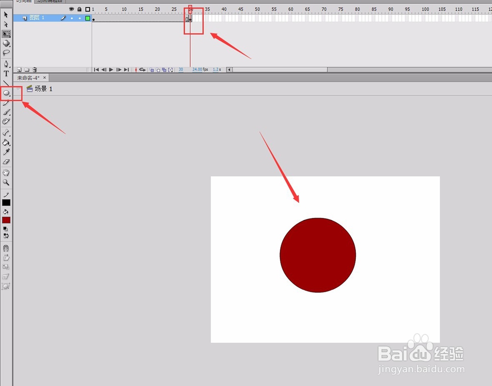 4/11点击插入空白关键帧命令,在该帧上绘制一掩糟包个圆形,如图所示: