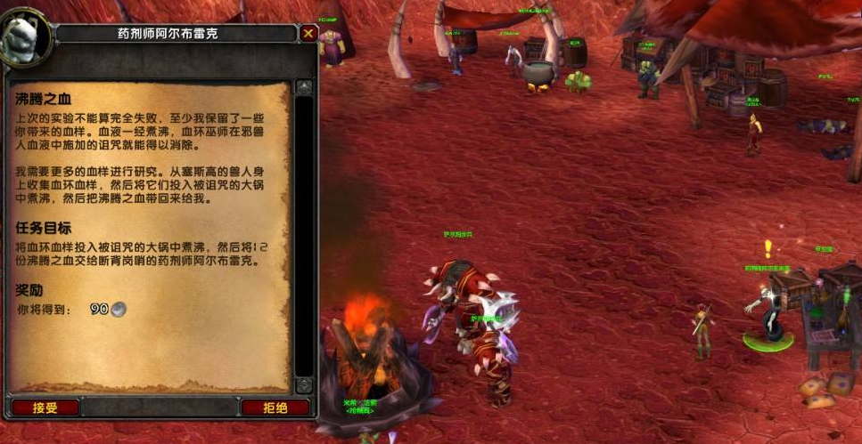 我需要更多的血样进行研究。从塞斯高的兽人身上收集血环血样,然后将它们投入被诅咒的大锅中煮沸,然后把沸腾之血带回来给我。