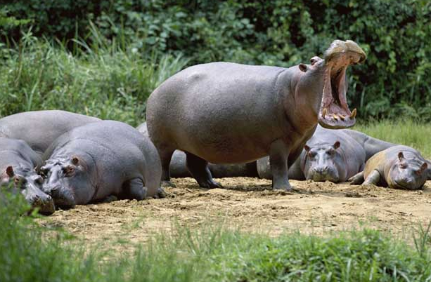 河马喜群居,善游泳,怕冷,喜温暖的气候环境。它们的皮肤长时间离水会干裂,而生活中的觅食、交配、产仔、哺乳也均在水中进行。河马是草食动物,但是稀疏獠牙长十厘米,母河马为保护小河马极具领域攻击性。