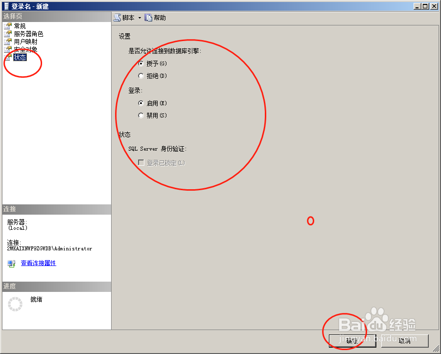 5/55、在点击状态选项,设置用户连接数据库的状态是否启用,给予授权,然后再点击确定即可。