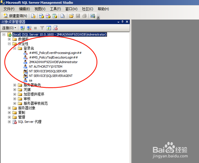 2/52、进去以后,找到安全性,点击安全性文件前面的+号,然后点再点击登录名前面的+号,这样你就可以看到目前数据库已有的登录账号。