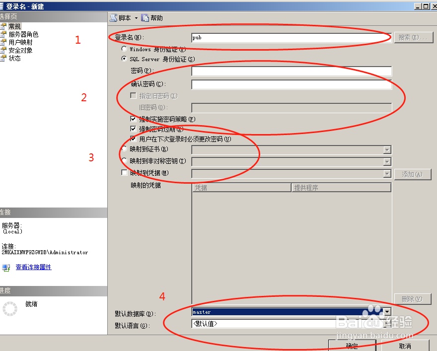 3/53、右键点击登录名,选择,新建登录名。在打开的页面,输入你的登录名、验证模式、密码和密码策略等等,还有下面的默认登录数据库名。
