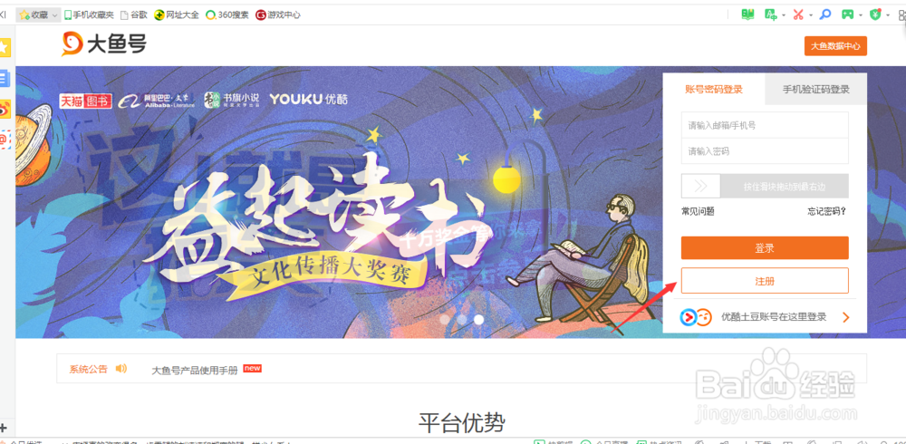 3/9进入大鱼号官网,点击箭头1处注册,如果已有优酷土豆账号也可以点击箭头2处直接登陆。