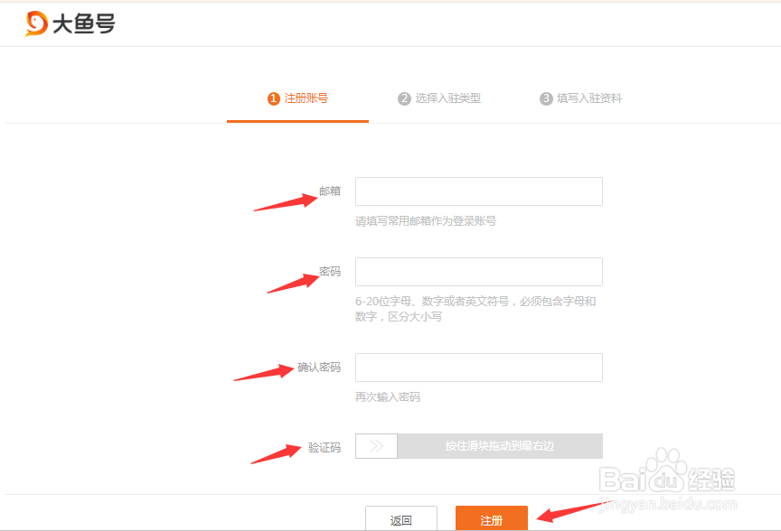 4/9填写注册信息:邮箱,密码,确认密码,验证码,最后点击注册。