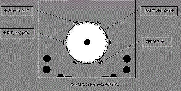 2、观察面板背面的电刷旋钮安装部位,它由3个电刷旋钮固定卡、2个电刷旋钢定位弧、1个钢珠安装槽和1个花瓣形钢珠滚动槽组成。